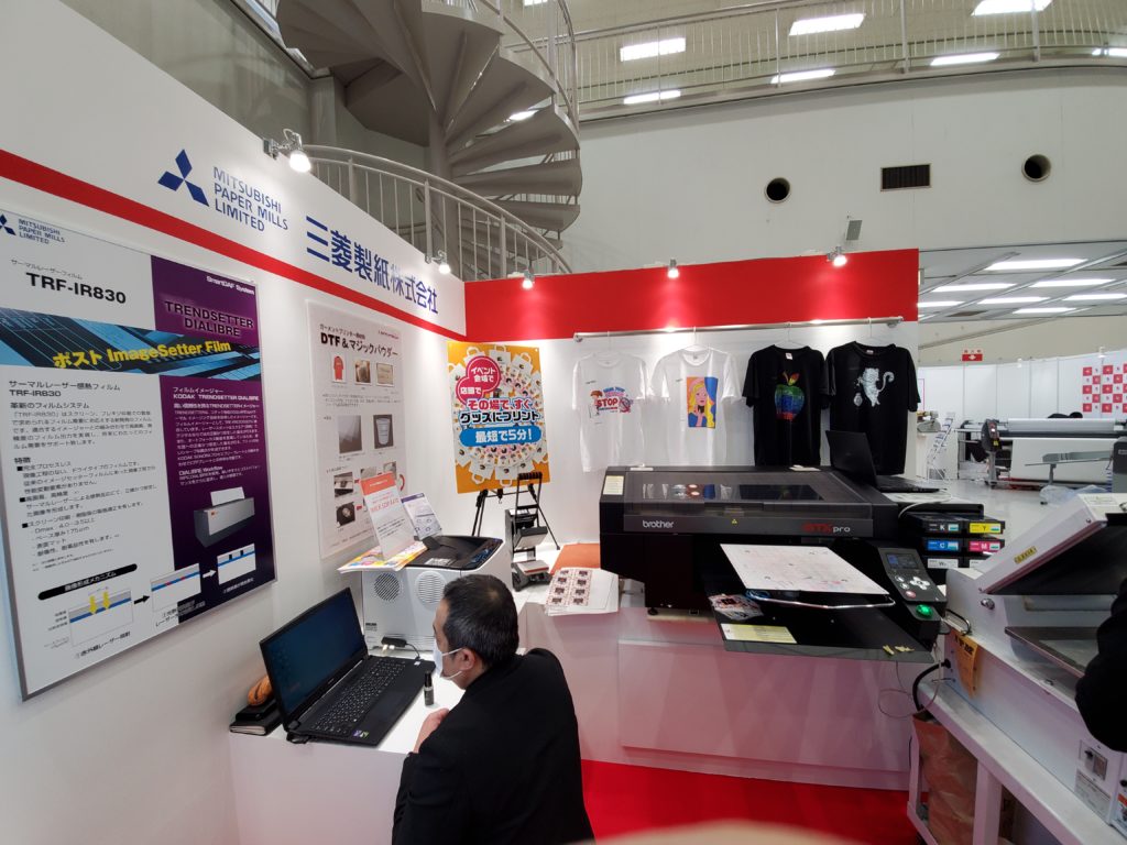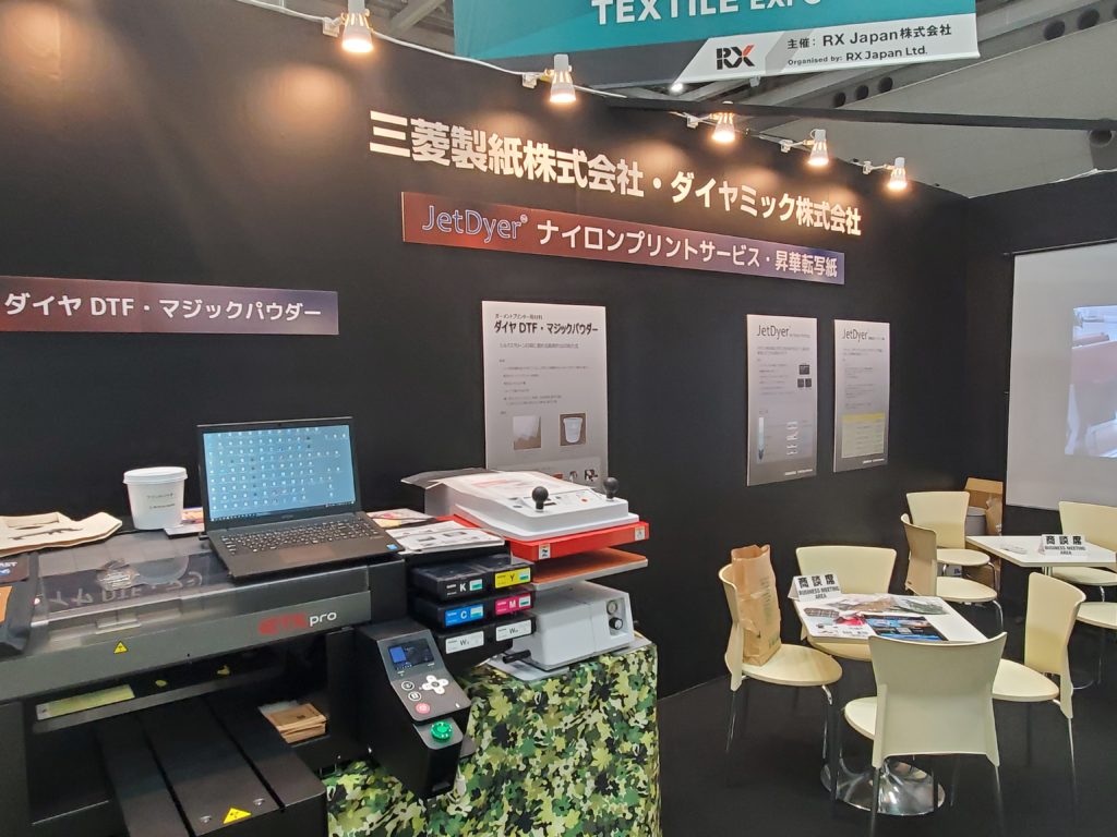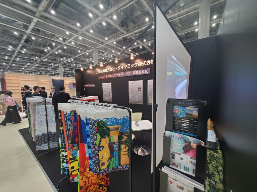 皆様、こんにちは! 今東京ビックサイトで開催中の「FaW TOKYO (ファッション ワールド 東京)春」に三菱製紙・ダイヤミックで出展中です。今回はナイロン生地へのプリントサービスやJetdyer転写紙、ガーメントプリンター用のマジックパウダーのご紹介をしております。