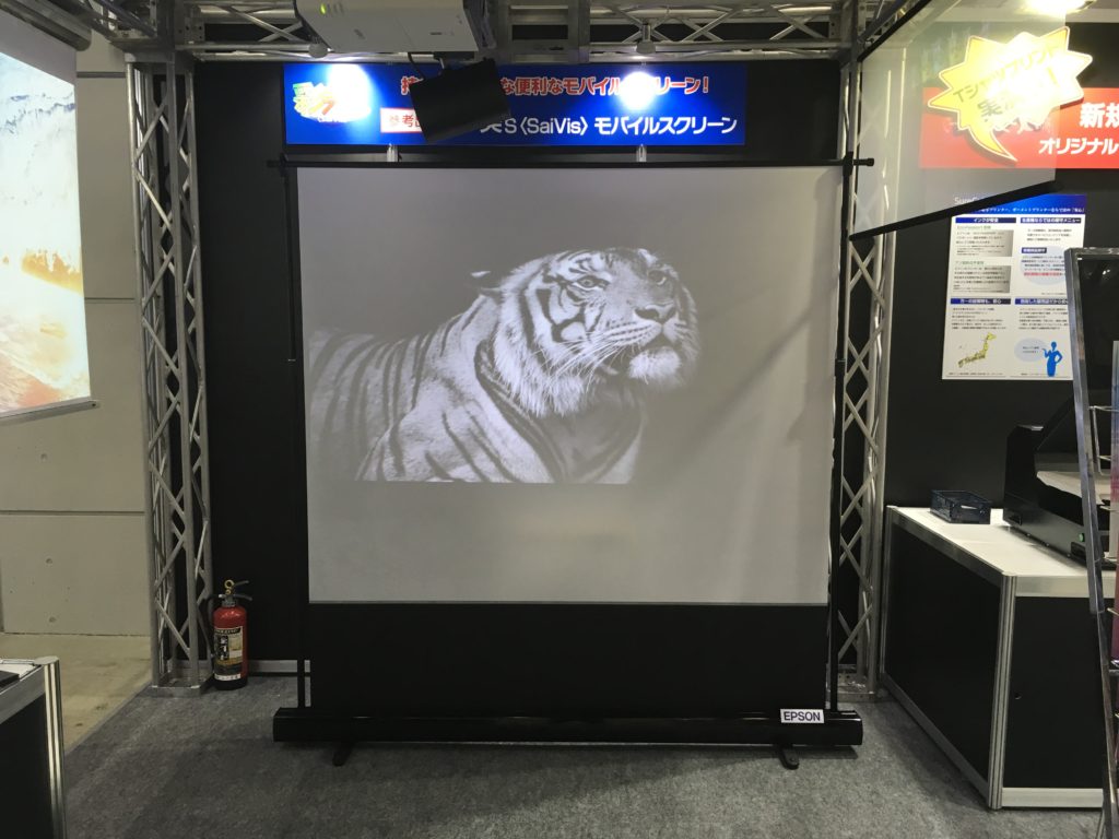 今回の展示会では、手動巻き上げ式のロールスクリーン、持ち運び可能なリア投写式モバイルスクリーンを初出展!