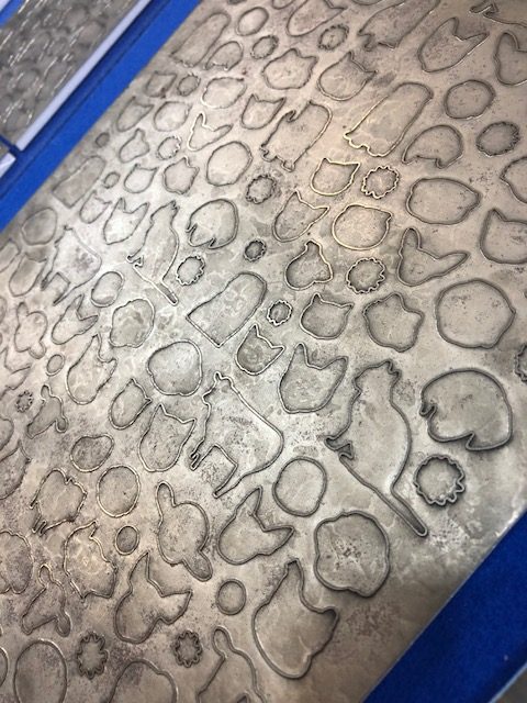 シールなどの型抜きに使われている金属製の抜き型で、カットする部分が盛りあがった形状となっております。金属を削り出して作っているように見えますが、実はスクリーン印刷でマスクしてエッチングし作られたものなのです。