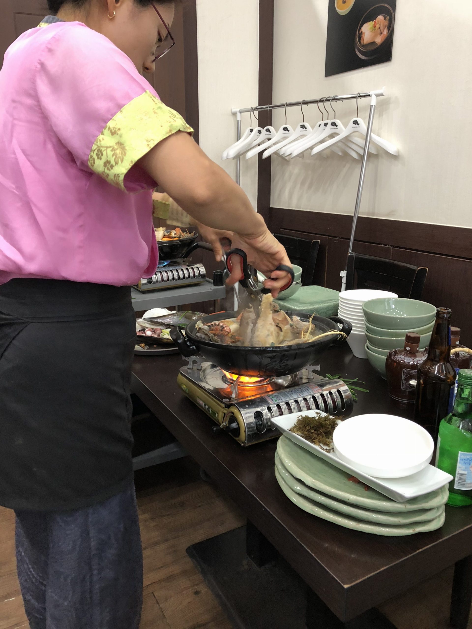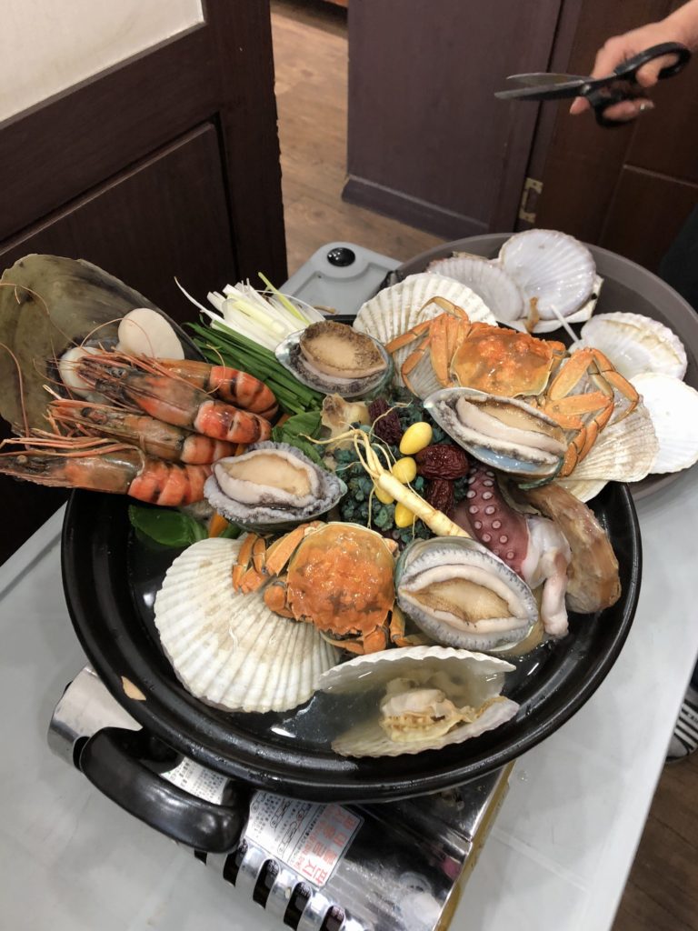 今宵の宴のメインディッシュは韓国の代表的な料理の一つサムゲタン。丸鶏と朝鮮人参などを煮込んだ薬膳料理というイメージでしたが、今回は新鮮な魚介類をこれでもかと投入した盆暮れ正月系の豪快料理‼︎