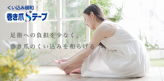 このたび三菱製紙株式会社より「巻き爪Sテープ」を発売いたしました。この商品は巻き爪のセルフケアのために足指に貼るテープです。